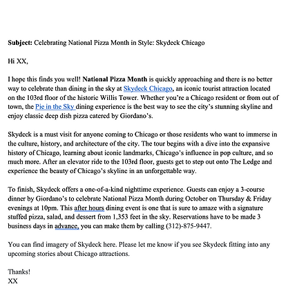Skydeck Chicago holds nighttime dining experiences from the 103rd or 99th floors. In this pitch, I use National Pizza Month as the angle to pitch to Chicago based journalists about the Pie in the Sky event.
